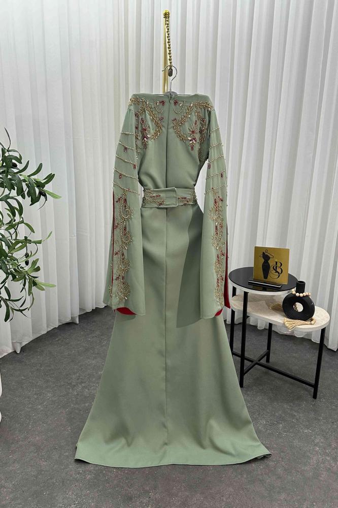 قفطان مغربي راقٍ مكون من قطعتين، مصنوع من خامة الباربي الفاخرة بلمسة انسيابية أنيقة. يتميز بتطريز يدوي دقيق يزين كامل التصميم، مطعّم بفصوص وأحجار الزركون اللامعة لإضفاء لمسة ملكية. التصميم مزود بأكمام واسعة مع فتحة أمامية راقية وحزام على الخصر لإبراز القوام. مثالي للمناسبات الفاخرة وحفلات الزفاف والسهرة.