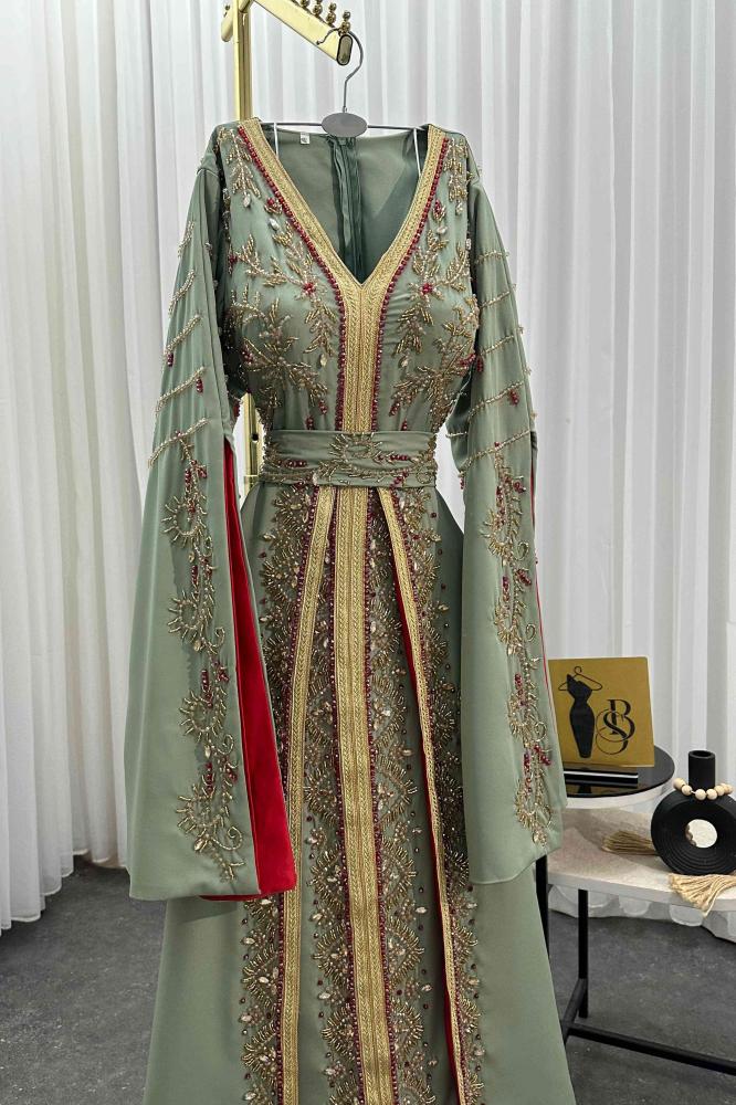 قفطان مغربي فخم قطعتين بتطريز يدوي وفصوص زركون