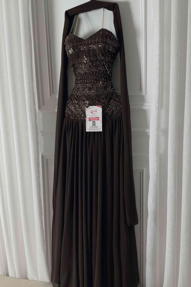 تألقي بإطلالة ملكية مع هذا الفستان الساحر المصنوع من خامة الشيفون الفاخرة، باللون البني الداكن الذي يفيض فخامة.