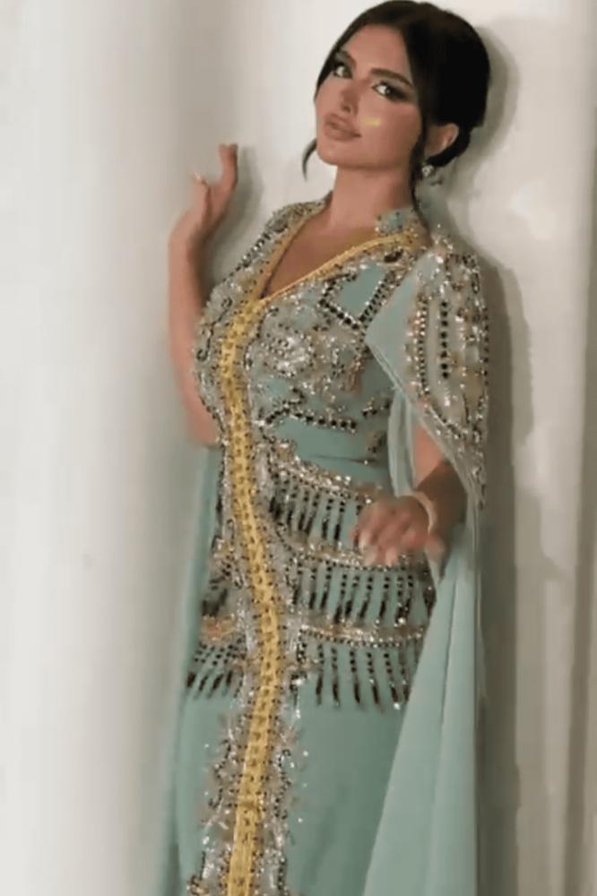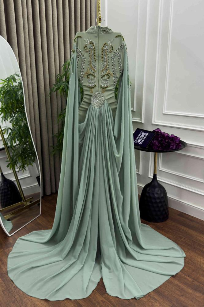 قفطان سهرة أنيق بلون أخضر بارد يمنح إطلالة راقية ومميزة، صُمم بقصة ضيقة مع شق أمامي يضفي لمسة عصرية جذابة. يتميز بتطريز فاخر من الخرز والكريستال الذهبي والفضي بتفاصيل دقيقة على الصدر والخصر، مما يعزز من فخامته. مزود بكاب طويل انسيابي يمنح إطلالة ملكية ساحرة تناسب المناسبات الفاخرة والاحتفالات الخاصة