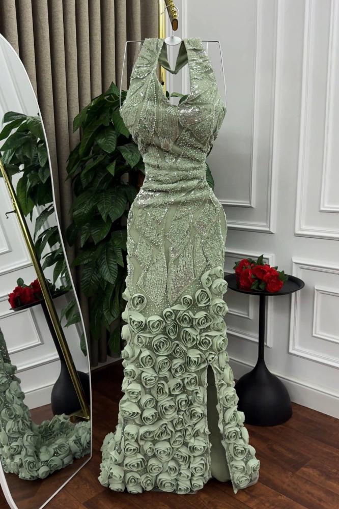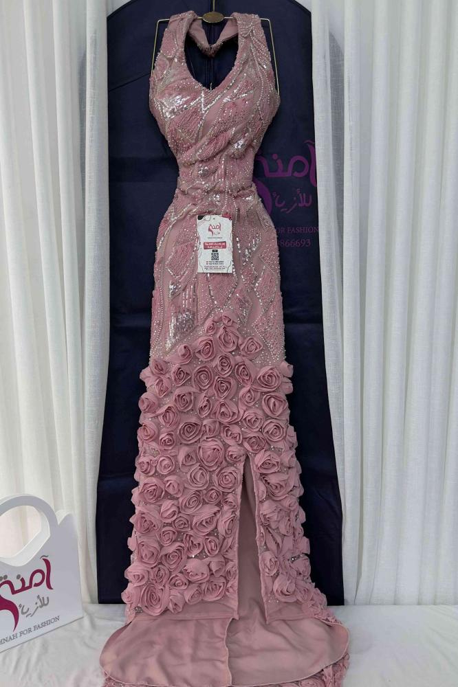 تميّزي بإطلالة أنثوية آسرة مع هذا الفستان الفاخر المصمم من قماش التول المطرز بتفاصيل لامعة. يتميز بقصة ضيقة تبرز جمال القوام، وتصميم رقبة مفتوحة بدون أكمام لإطلالة راقية. ما يجعله فريداً هو الذيل المصنوع من ورود مجسّمة ثلاثية الأبعاد تضيف فخامة وأناقة لا تُضاهى.
